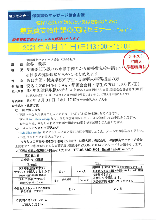 療養費支給申請の実践セミナーを開催白鳥ないし徐 まで 電話03-6260-8904
