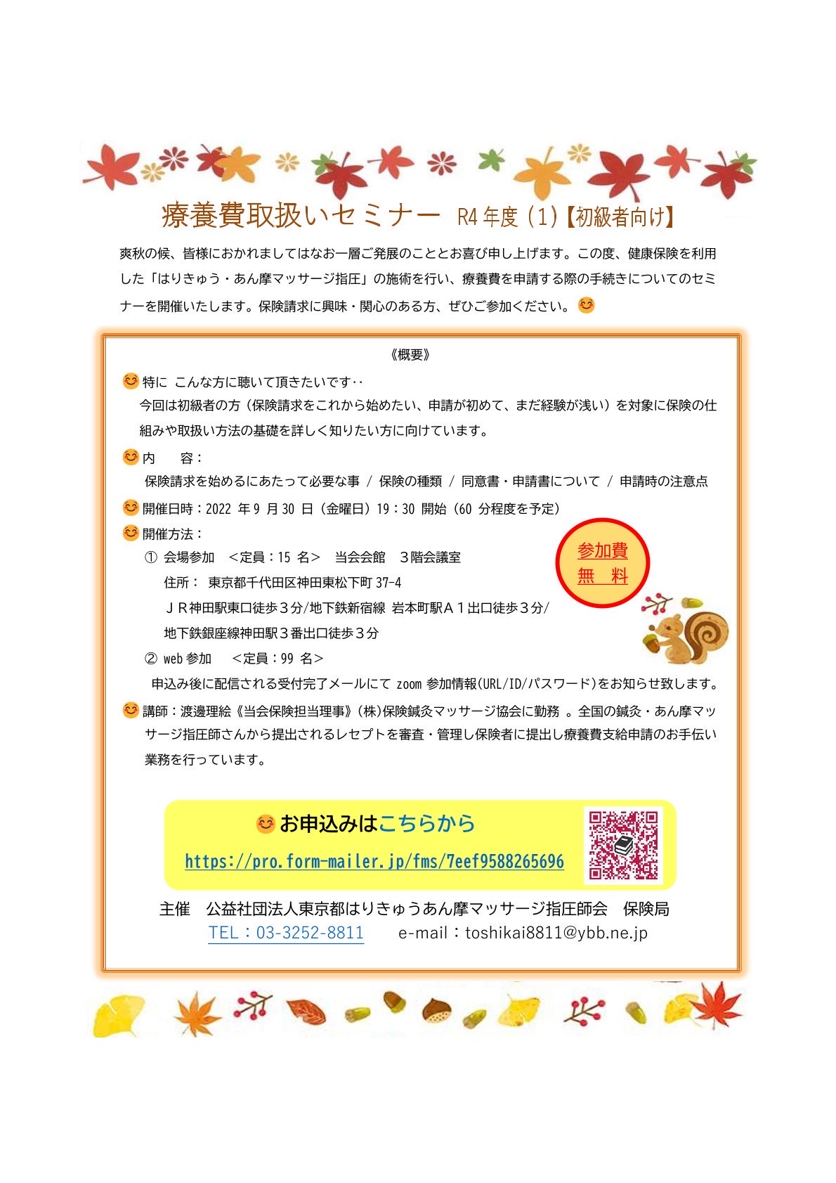 爽秋の候、皆様におかれましてはなお一層ご発展のこととお喜び申し上げます。この度、健康保険を利用した「はりきゅう・あん摩マッサージ指圧」の施術を行い、療養費を申請する際の手続きについてのセミナーを開催いたします。保険請求に興味・関心のある方、ぜひご参加ください。