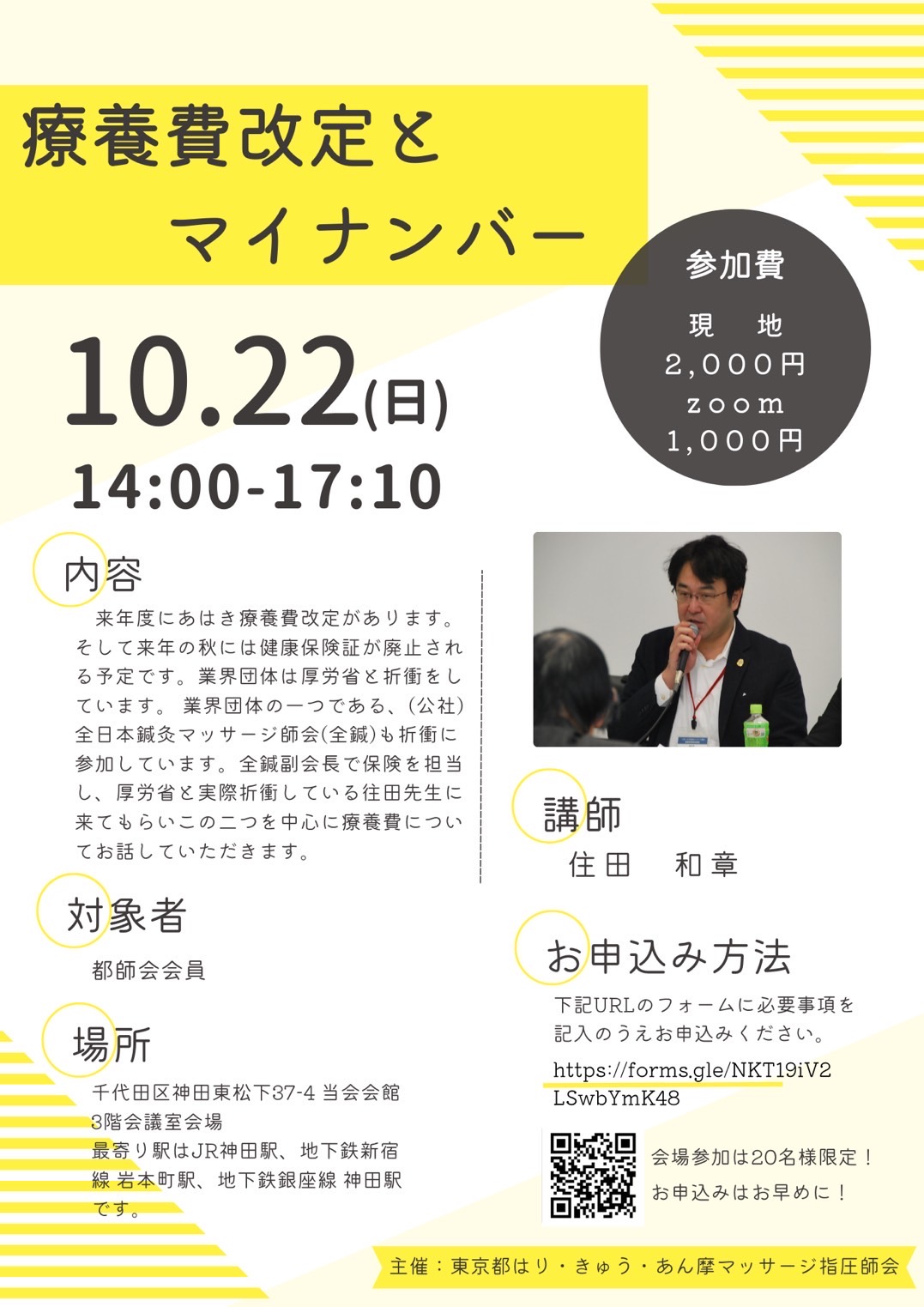 療養費改定とマイナンバーについて 来年度にあはき療養費改定があります。そして来年の秋には健康保険証が廃止される予定 です。業界団体は厚労省と折衝をしています。 業界団体の一つである(公社)全日本鍼灸マッサージ師会(全鍼)も折衝に参加しています。全鍼副会長で保険を担当し、厚労省と実際折衝している往田先生に来てもらいこの二つを中心に療養費について話してもらいます。
