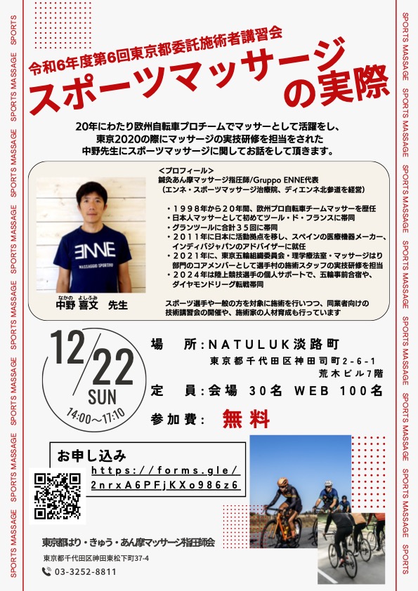 20年にわたり欧州自転車プロチームでマッサーとして活躍をし、東京2020の際にマッサージの実技研修を担当された中野先生にスポーツマッサージに関してお話をして頂きます。